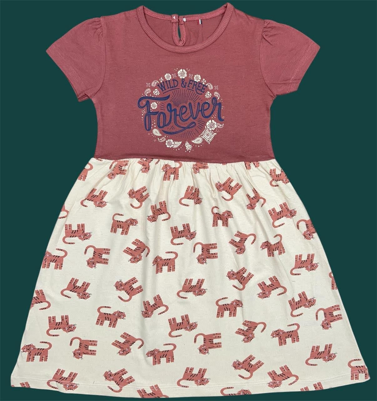 This charming dress features a soft maroon top with a motivational print and a cream skirt covered in adorable tiger designs. Made from lightweight, breathable cotton, it’s perfect for everyday wear — from adventures at the park to weekend outings.