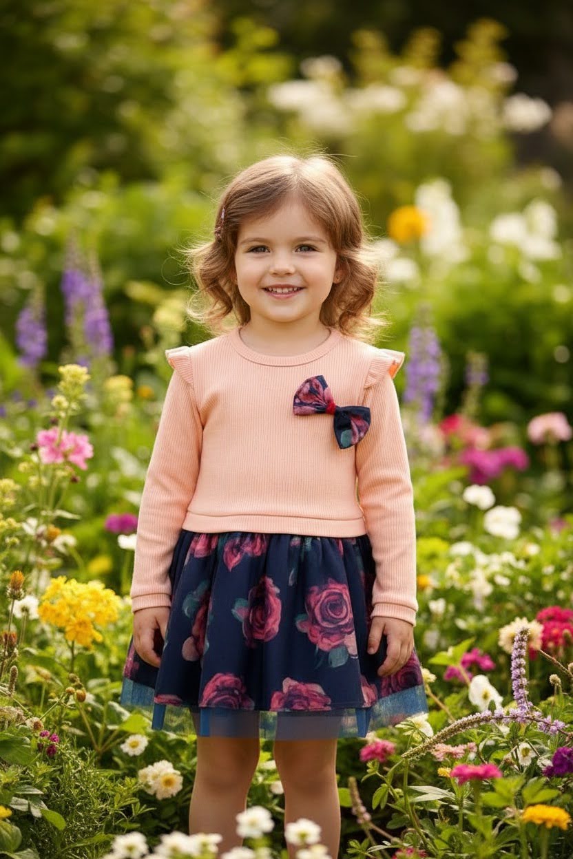 Add a touch of charm to your little one’s wardrobe with this adorable Peach & Floral Bow Dress for Girls. Designed with a soft peach ribbed cotton top and a beautifully flared floral skirt, this dress blends comfort with elegance. The cute bow detail on the chest adds a playful accent, making it perfect for everyday wear as well as special occasions.